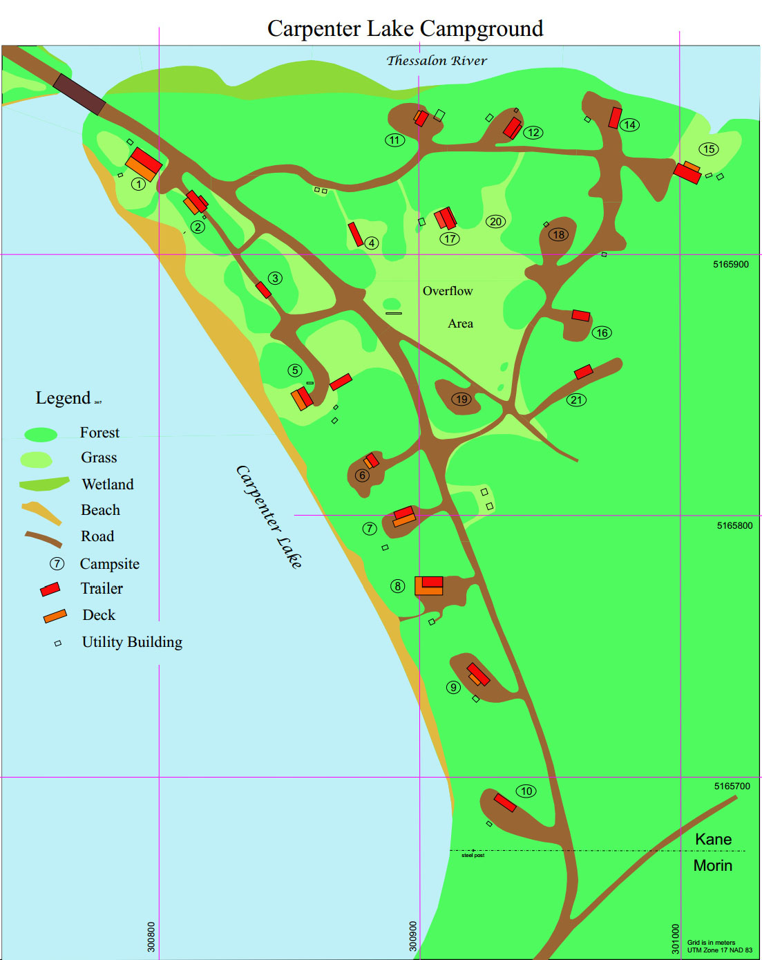 The Carpenter Lake Campground is situated a few hundred meters from the lodge and has large private campsites situated along the lakefront, river side and at off-water locations (see map).